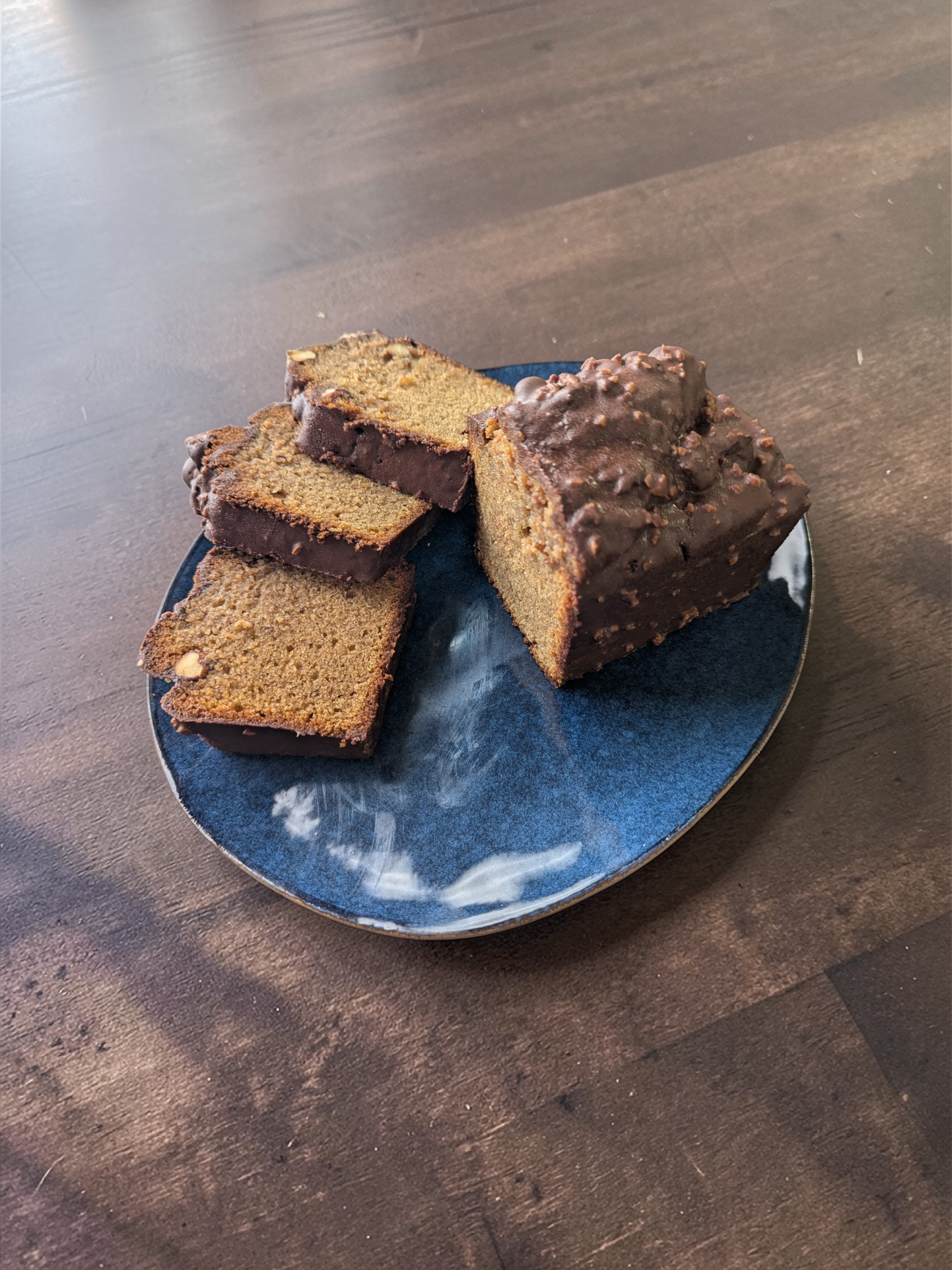 Un cake à la noisette ultra gourmand avec un enrobage rocher au chocolat.